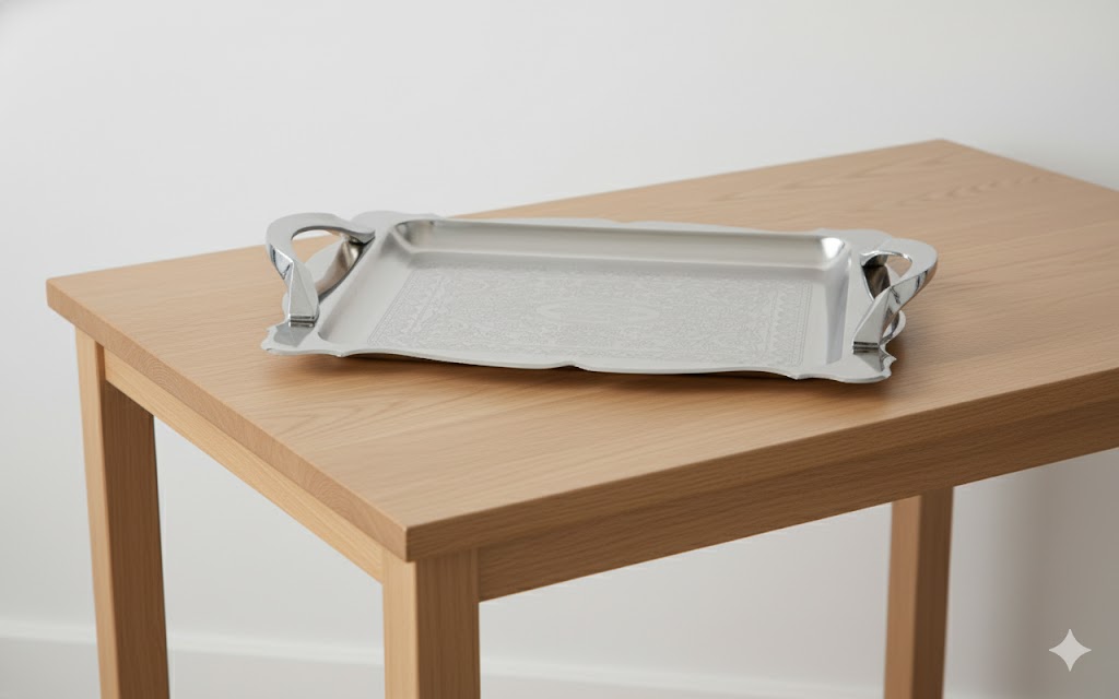 - طراحی کلاسیک و مدرن: ترکیب خطوط ساده و طرحهای حکاکی شده، این سینی را به یک قطعه هنری تبدیل کرده است.