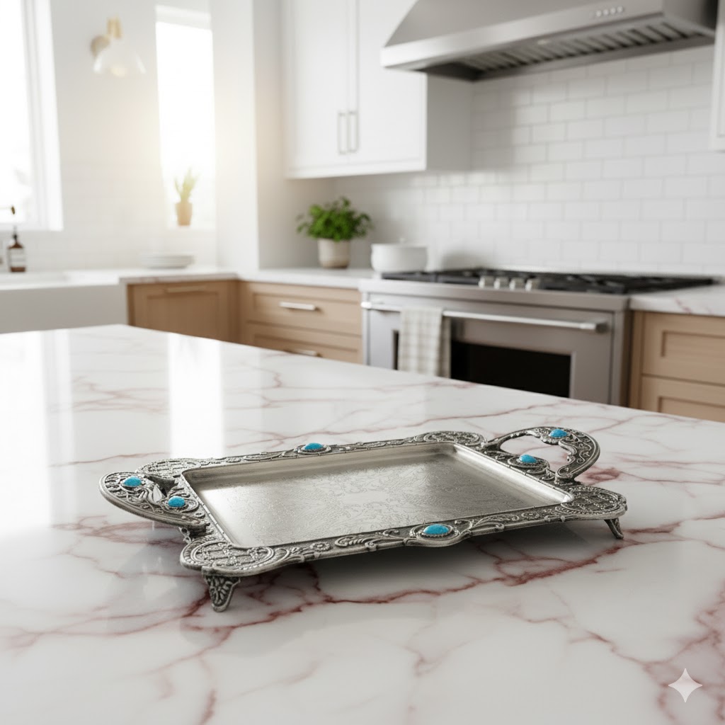 شرکت یونیک که برندی معروف در زمینه تولید لوازم آشپزخانه است، دست به تولید انواع سینی در سایز ها و طرح های مختلف زده. “سینی پیوتر متوسط نگین دار یونیک کد 1447″ یک سینی بسیار زیبا از جنس پیوتر است. این آلیاژ که به نام مسوار هم شناخته می شود ترکیبی است از مس و قلع و رنگی بین زرد و مسی دارد. از این رو بسیاری از وسایل خانگی و تزیینی از این آلیاژ ساخته می شود. این سینی دارای دسته و پایه است و مناسب مهمانی ها و مجالس خاص شما می باشد. برای زیبایی بیشتر این محصول یونیک از نقش های برجسته و نگین های فیروزه ای رنگی استفاده کرده که طرحی اصیل و چشم نوازی به وجود آورده.