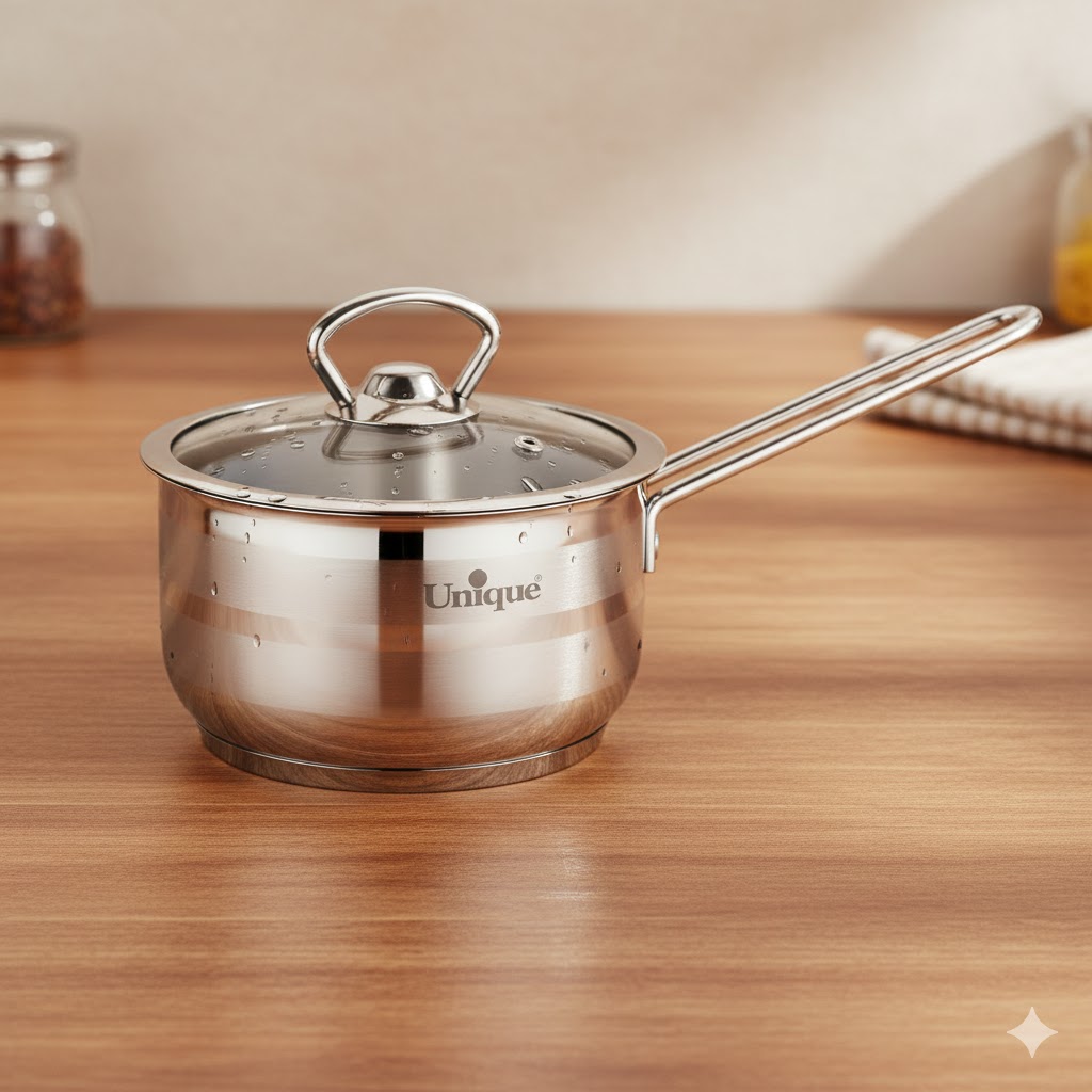 استیل به دلیل واکنش پذیری کمی که با مواد غذایی دارد یکی از مواد اصلی ساخت وسایل آشپزی است. این فلز در برابر زنگ زدگی و خوردگی مقاوم است. همچنین مانند دیگر فلزات مثل آلومینیوم و چدن نیاز به روکش گردن با تفلون و سرامیک ندارد. در نتیحه از نظر استاندارد های سلامتی یکی از بهترین فلزات برای ظروفی مانند قابلمه و تابه است. “شیر جوش استیل سایز 16 یونیک کد 9952″ از جنس استیل ضد زنگ و دارای دری شیشه ای است. یک دسته استیل با کیفیت در کنار این شیر جوش تعبیه شده که در برابر سوختن مقاوم است. در کف این ظرف لایه ای جهت پخش یکنواخت حرارت تعبیه شده.
