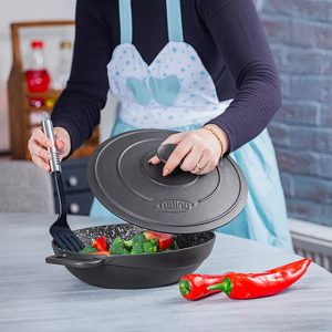 • جنس چدن باکیفیت: چدن به عنوان بهترین ماده برای پخت و پز شناخته می‌شود. حرارت را به طور یکنواخت پخش کرده و باعث می‌شود غذا به آرامی پخته شود و طعم بهتری پیدا کند.