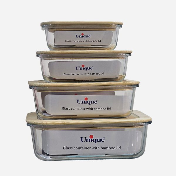 ظرف فریزری 4 تیکه درب بامبو یونیک کد 1407-UN: سلامتی، زیبایی و نظم: انقلابی در آشپزخانه شما با ظروف شیشهای “Unique” و درب بامبو!