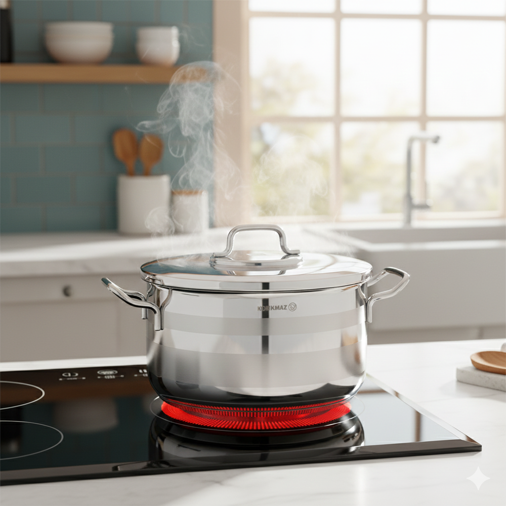 توزیع حرارت ایدهآل: تضمین میکند که حرارت به سرعت جذب شده و به طور کاملاً یکنواخت در کف قابلمه توزیع میشود. این ویژگی برای پختهایی که نیاز به دمای پایدار دارند (مانند پخت برنج یا تهچین) حیاتی است و از سوختن غذا در نقاط مرکزی جلوگیری میکند.