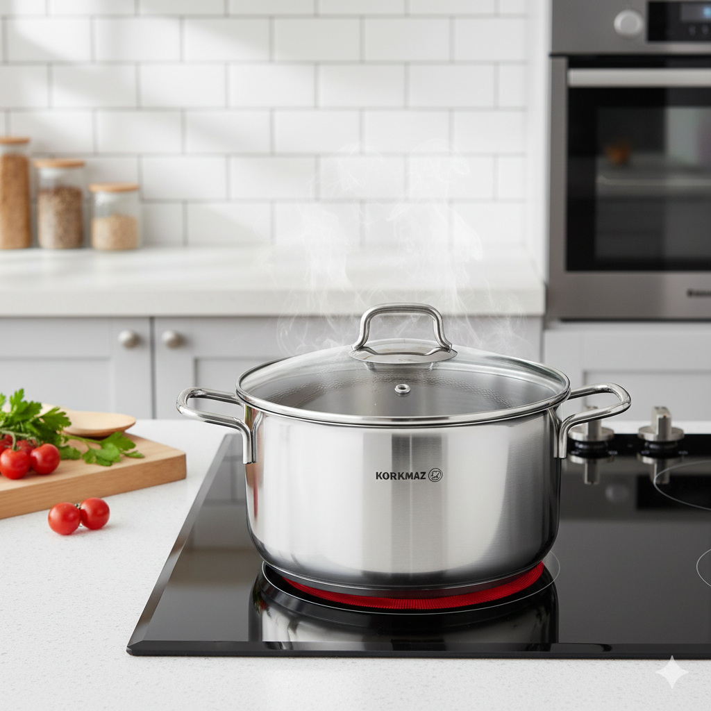 بدنه قابلمه از بهترین نوع استیل ضدزنگ کروم-نیکل (18 درصد کروم و 10 درصد نیکل) ساخته شده است. این ترکیب تضمینکننده مقاومت بالا در برابر زنگزدگی، درخشش ماندگار و بهداشتی بودن کامل برای تماس با مواد غذایی است.