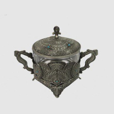 برای کسانی که به زیبایی و دکوراسیون منزل و پذیرایی میهمانان خود اهمیت میدهند وجود یک قندان خاص و زیبا بر روی میز پذیرایی آشکار است. “قندان پیوتر یونیک کد 1388-1” تشکیل شده از ظرفی شیشه ای قرار گرفته بر روی پایه ای از جنس پیوتر که رنگی بین سیاه و طوسی دارد. این محصول از جنس آلیاژ پیوتر ساخته شده و روی آن ها با از نقوش برجسته تریین شده است. این طرح ها باعث شده تا این محصولات در طی سال ها زیبایی خود را حفظ کرده و قابل استفاده باشند.