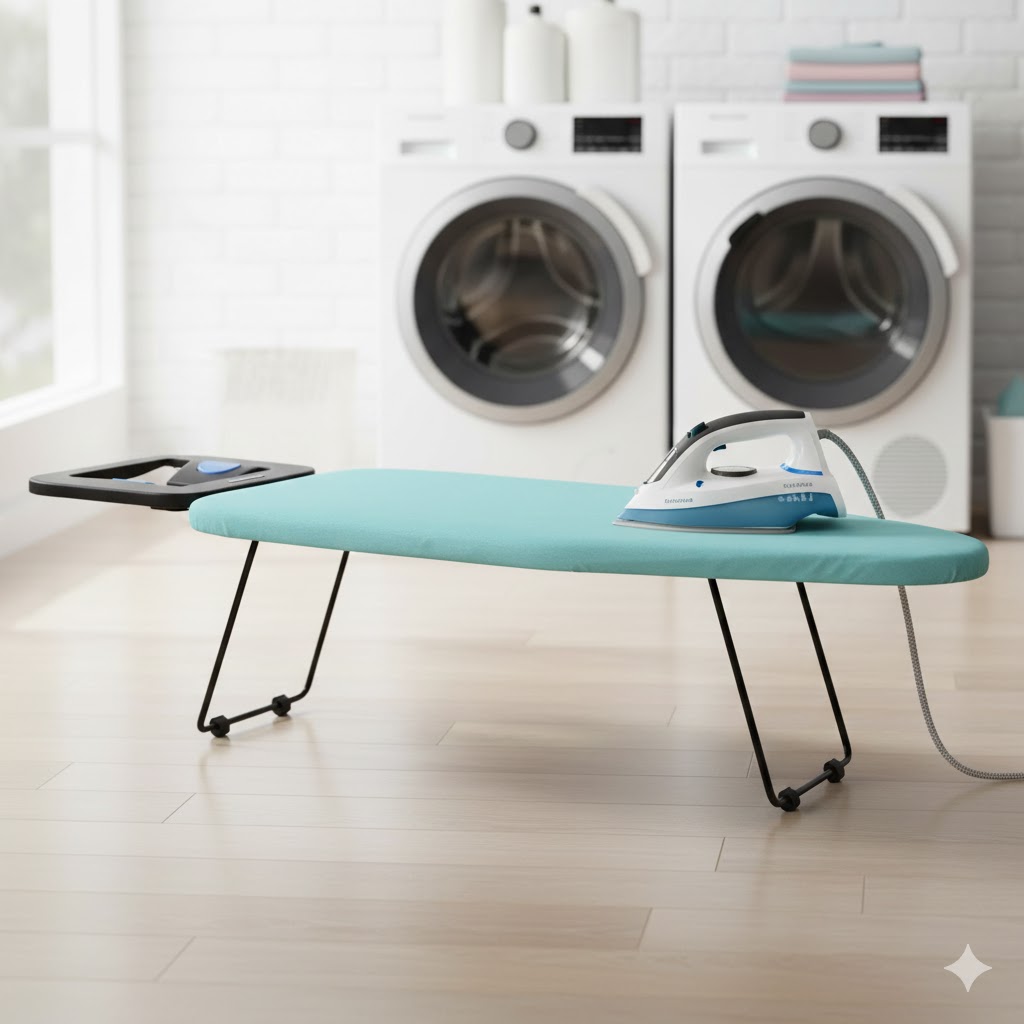 صفحه زیرین این میز مشبک است و اجازه در شدن بخار را میدههد تا سطح میز خیس نشود. این صفحه با یک اسفنج و روکش پارچه ای پوشیده شده تا اتو زدن را هر چه بیشتر راحت کند. صفحه کناری میز فلزی و برای قرار دادن اتو است.