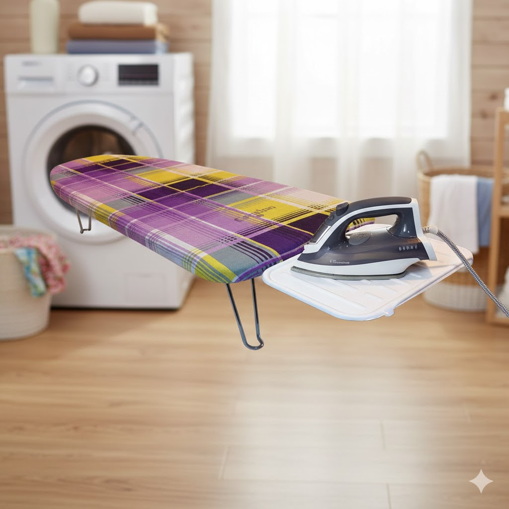 صفحه زیرین این میز مشبک ایت و اجازه در شدن بخار را میدههد تا سطح میز خیس نشود. این صفحه با یک اسفنج و روکش پارچه ای پوشیده شده تا اتو زدن را هر چه بیشتر راحت کند. صفحه کناری میز فلزی و برای قرار دادن اتو است.