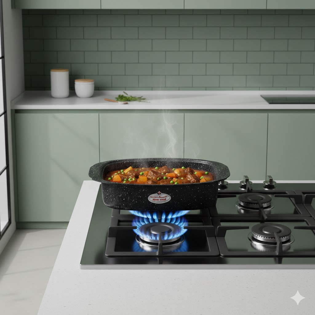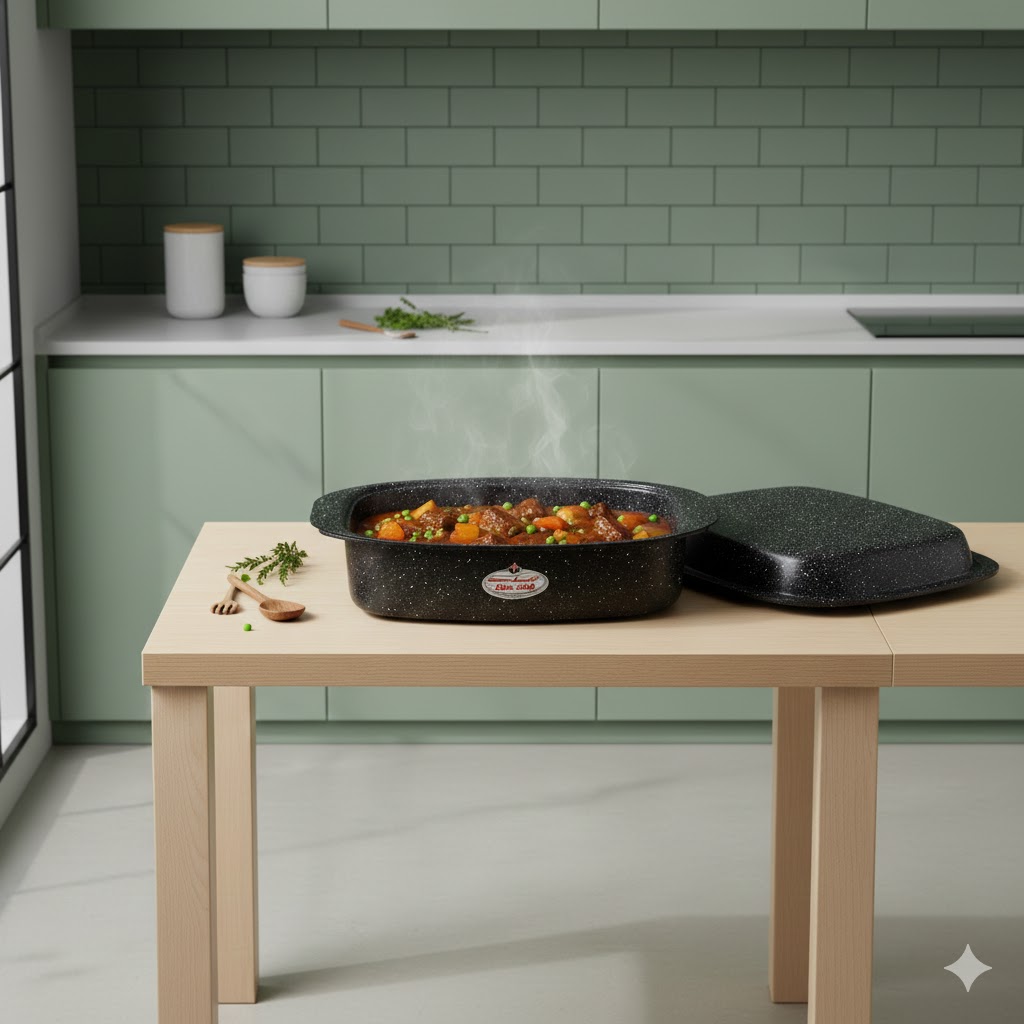 - شکل مستطیلی این ظرف، فضای بیشتری را برای قرار دادن مواد غذایی فراهم میکند و برای پخت غذاهای حجیم مناسب است.