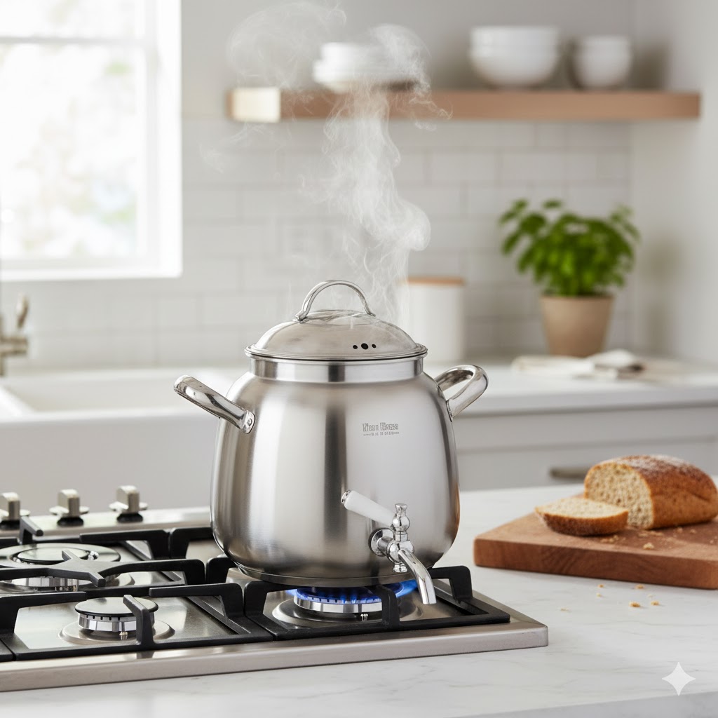 بدنه کاملاً استیل ضدزنگ این کتری، به همراه دستههای نسوز، اطمینان از دوام و کارایی بالای آن را به کاربران میدهد. خروجی آب به شکل شیر با ضامن، استفاده راحتی را برای هر کاربر فراهم میکند، بدون اینکه نیاز به بلند کردن کتری برای ریختن آب باشد.