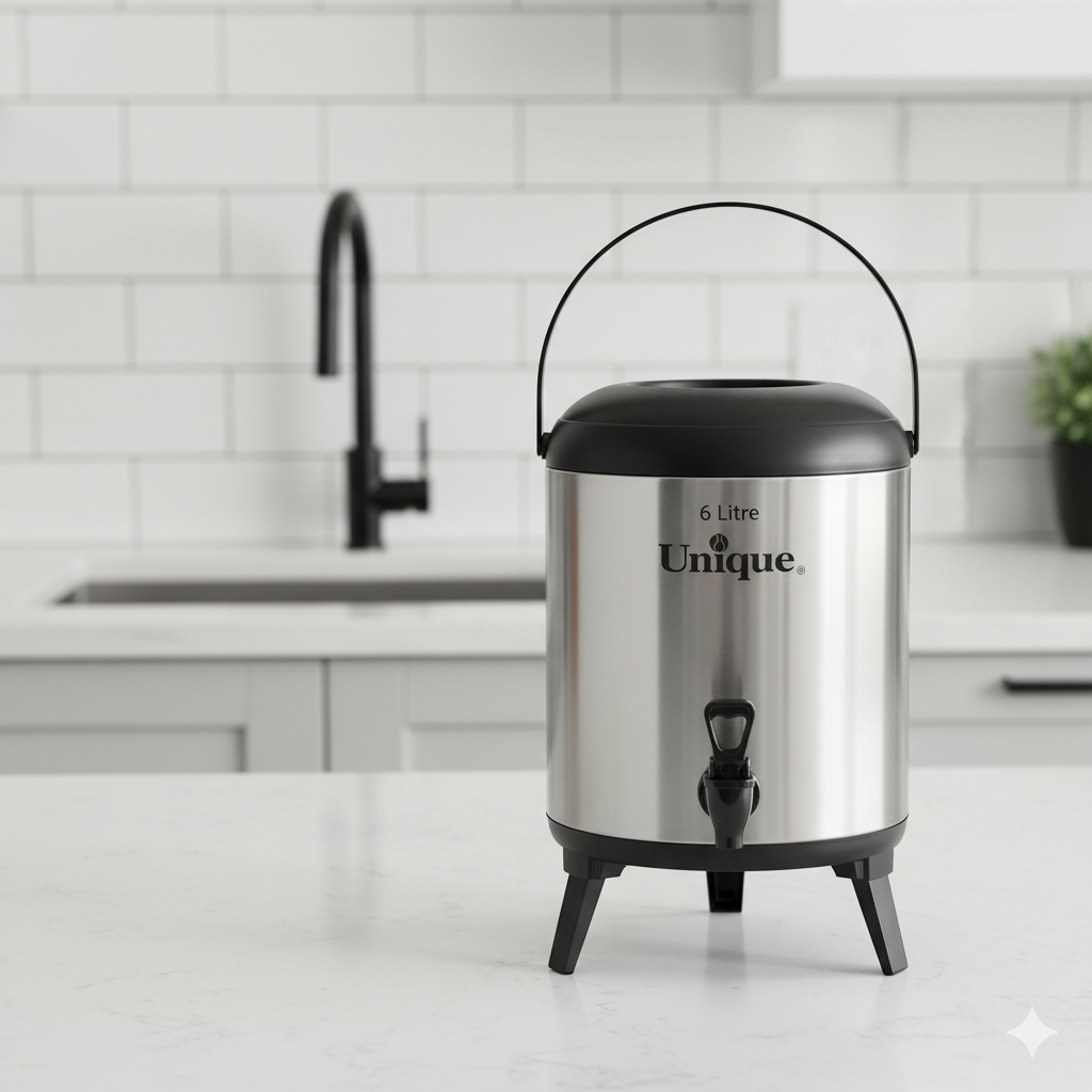 “کلمن استیل 8 لیتری یونیک کد 7590” با بدنه استیل ساخته شده. این کلمن توانایی حفظ دمای مایع دارد. درب بالایی آن به صورت پیچی است و خروجی به صورت ضامن دار طراحی شده است. این کلمن دارای سه پایه پلاستیکی است که استفاده از آن را روی زمین راحت تر می کند و نیازی به بلند کردن کلمن برای ریختن آب نیست.