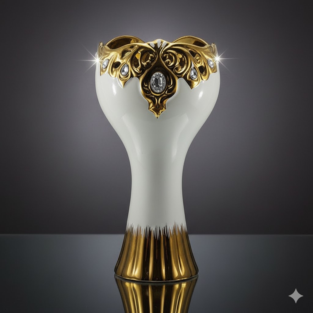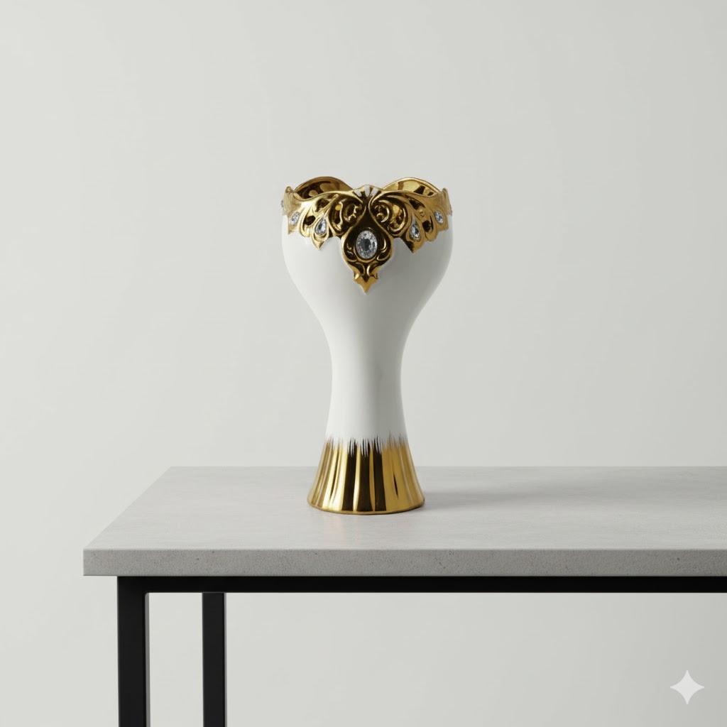 گلدان بزرگ سرامیک طلایی یونیک کد 1689 ساخته شده از سرامیک و دارای لعابی سفید در پس زمینه است. این لعاب سفید رنگ به وسیله یک لعاب طلایی درخشان و کریستال های متعدد تزیین شده تا هر چه زیباتر بدرخشد. جنس سرامیکی این ظرف باعث شده تا نسبت به ظروف چینی معمولی سبک تر باشد اما استحکام خود را حفظ کند.